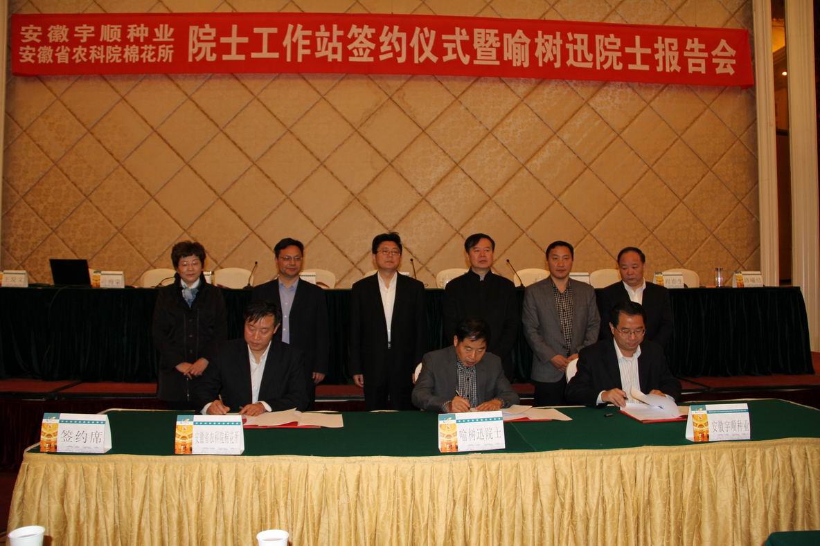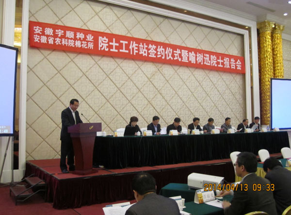 2014年4月13日上午,由中國工程院喻樹迅院士與安徽宇順種業(yè)開發(fā)有限公司、安徽省農(nóng)科院棉花所共建成立的“棉花院士工作站”簽約儀式在安慶碧桂園鳳凰酒店舉行,標(biāo)志著全市首家農(nóng)業(yè)院士工作站簽約成立。中國農(nóng)科院棉花所研究員、中國工程院院士喻樹迅,安徽省農(nóng)科院院長楊劍波以及省農(nóng)業(yè)機(jī)械推廣總站、省農(nóng)科院棉花所、國家棉花長江試驗(yàn)站等部門的領(lǐng)導(dǎo)專家出席簽約儀式。市農(nóng)委、市科技局、市財(cái)政局,有關(guān)縣區(qū)農(nóng)委(農(nóng)業(yè)局)負(fù)責(zé)人和相關(guān)技術(shù)人員參加簽約儀式。簽約儀式由市政府副秘書長張仕慶主持。市政府副市長張小青在儀式上指出,安慶農(nóng)業(yè)基礎(chǔ)較好,是國家農(nóng)業(yè)部確定的棉花優(yōu)質(zhì)生產(chǎn)區(qū)域,現(xiàn)已發(fā)展為全國棉花紡織精品生產(chǎn)基地,我市的望江縣和宿松縣是全國著名的棉花百強(qiáng)縣。他強(qiáng)調(diào),院士工作站的成立契合我市農(nóng)業(yè)領(lǐng)域正在實(shí)施的“5211”工程,必將進(jìn)一步提升我市棉花生產(chǎn)儲(chǔ)運(yùn)能力和科技科研水平,為實(shí)現(xiàn)我市乃至我省棉花生產(chǎn)方式的根本變革提供技術(shù)支撐,也必將推進(jìn)我市農(nóng)業(yè)產(chǎn)業(yè)化整體水平。